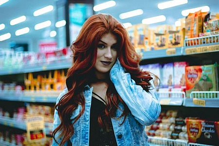 A woman with vibrant red hair is standing in the aisle of a store, looking at products on the shelves. She is browsing the items as she shops for groceries or household goods.
