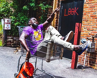 Young Man and Shopping Cart, Having Fun