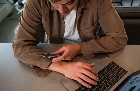 Man with laptop and credit card on desk engages in online shopping or digital finance management in a modern setting