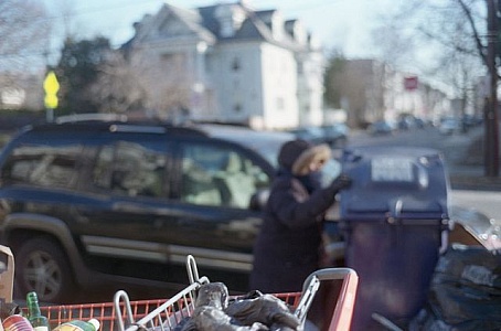 Urban snapshot with person at trash can