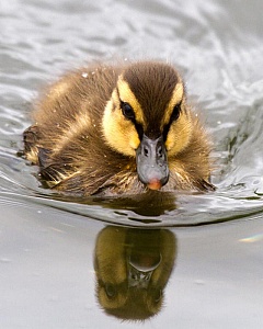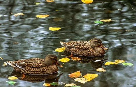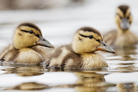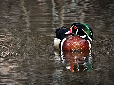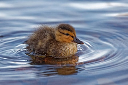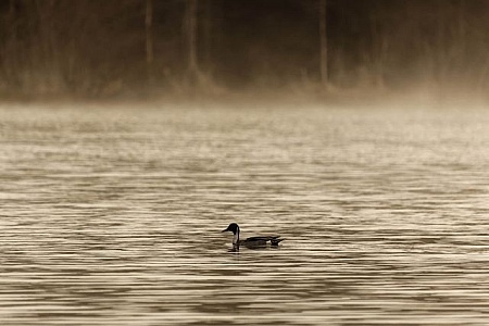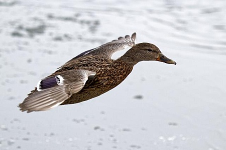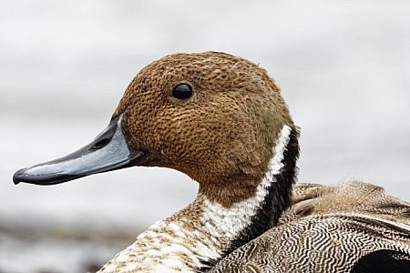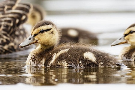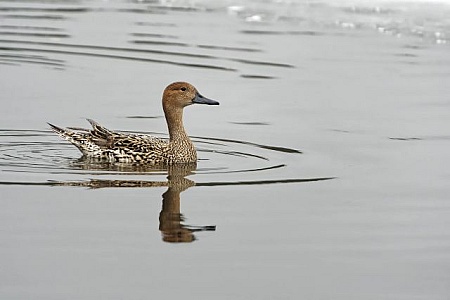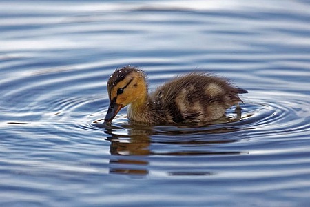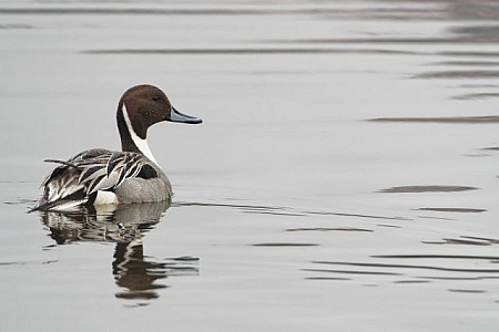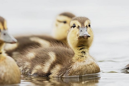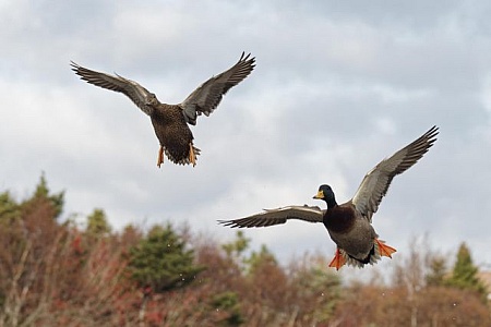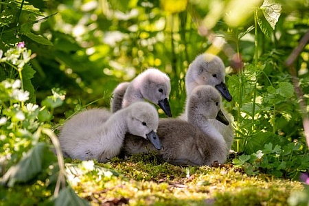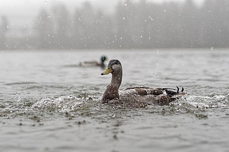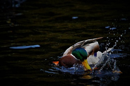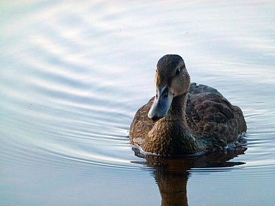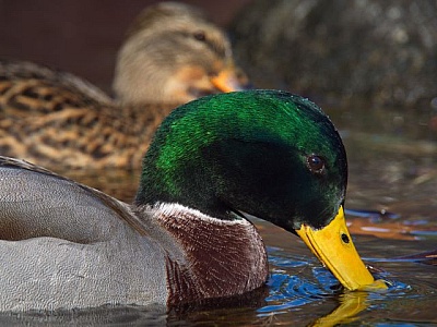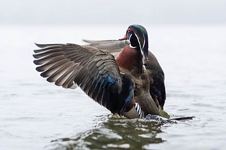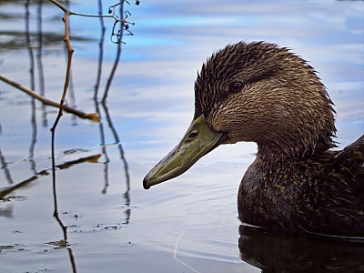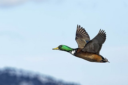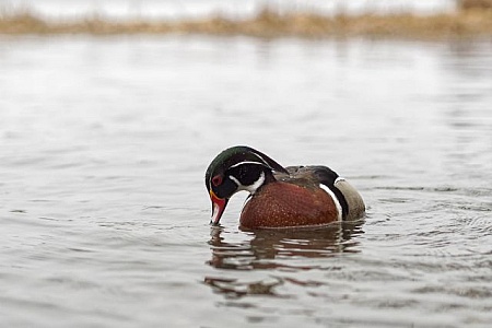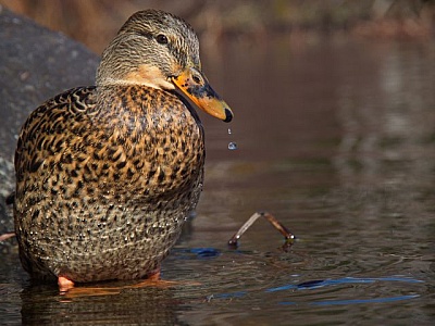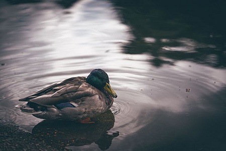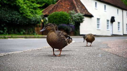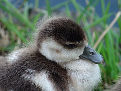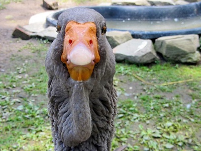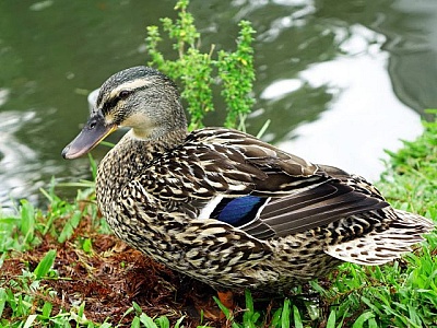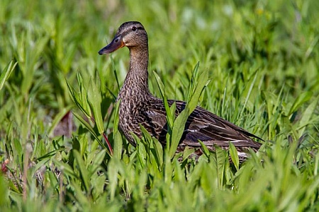A duck with a notably large beak is captured standing in the lush green grass, with its feathers glistening under the sunlight. The duck appears alert, surveying its surroundings while blending in with the natural environment.